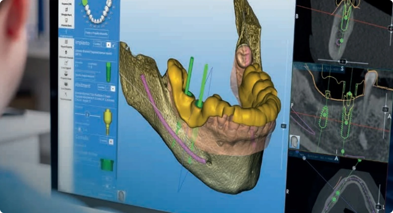 Les progrès de l’informatique et des examens radiologiques en trois dimensions (cône beam réalisé dans notre cabinet dentaire) associés à un logiciel spécifique nous permettent de simuler la future prothèse dentaire et la pose idéale des implants dentaires.